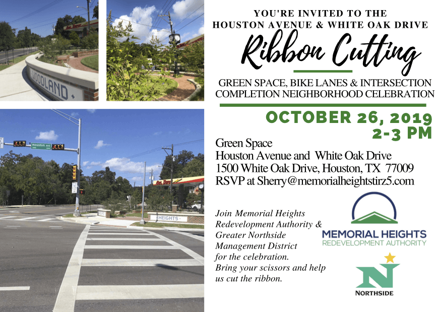 You are invited to the Houston Avenue & White Oak Drive Ribbon Cutting. Come celebrate the new Green Space, Bike Lanes and Intersection Completion. Join the Memorial Heights Redevelopment Authority & Greater Northside Management District for the celebration. Bring your scissors and help us cut the ribbon.
