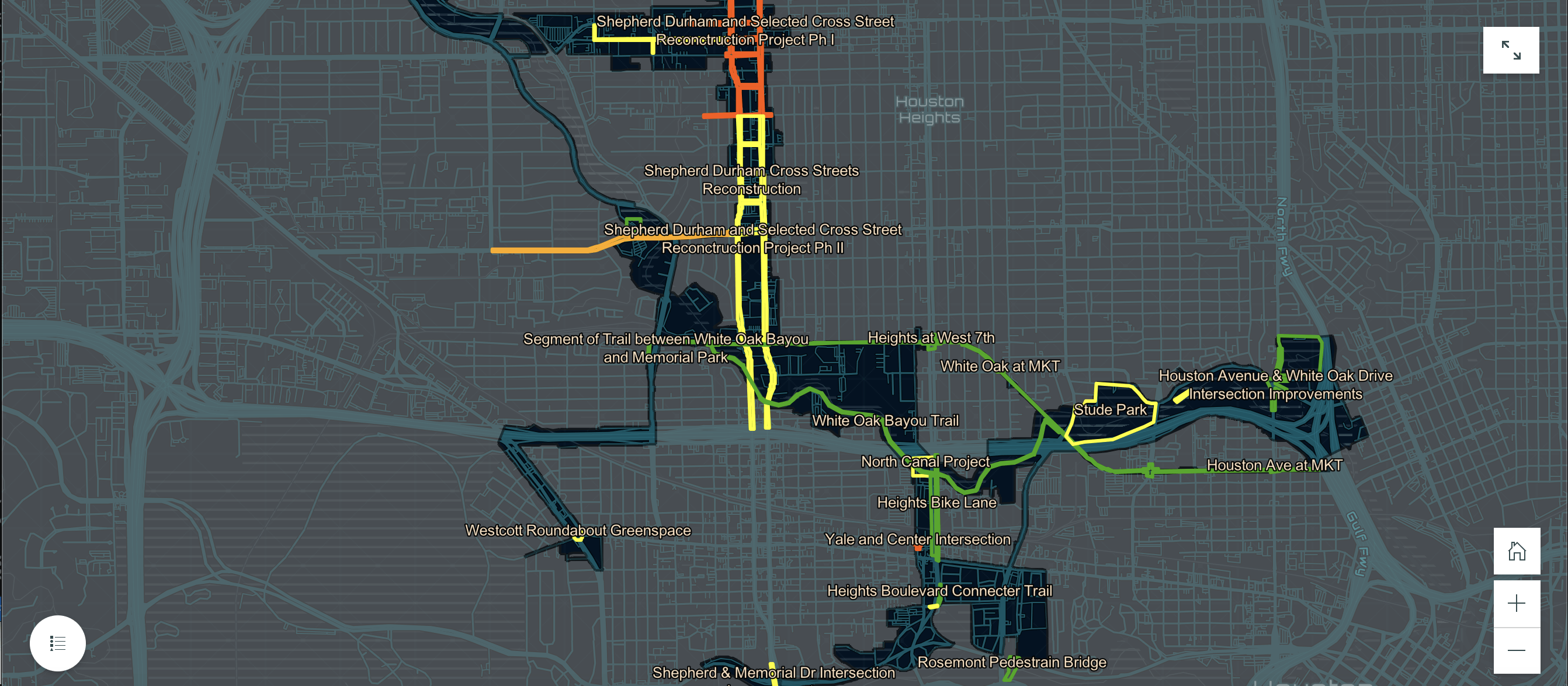 This map provides an overview of the Memorial Heights Redevelopment Authority 2020-2024 Capital Improvement Plan. Click here to see descriptions of each project and to view the story map, which details the cost, status, and duration of each project.